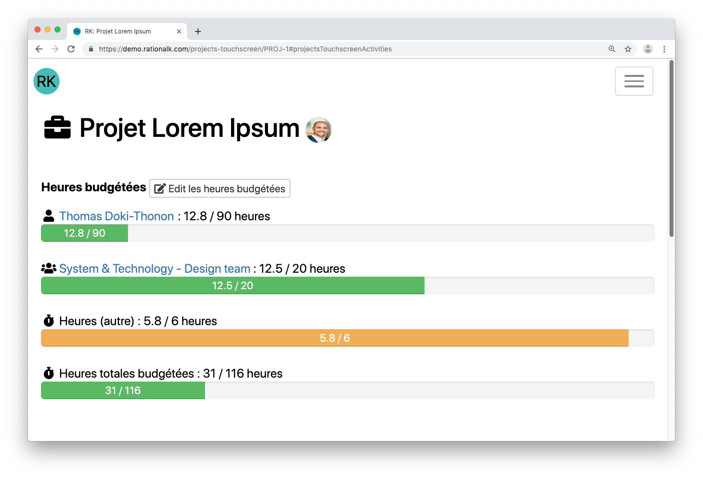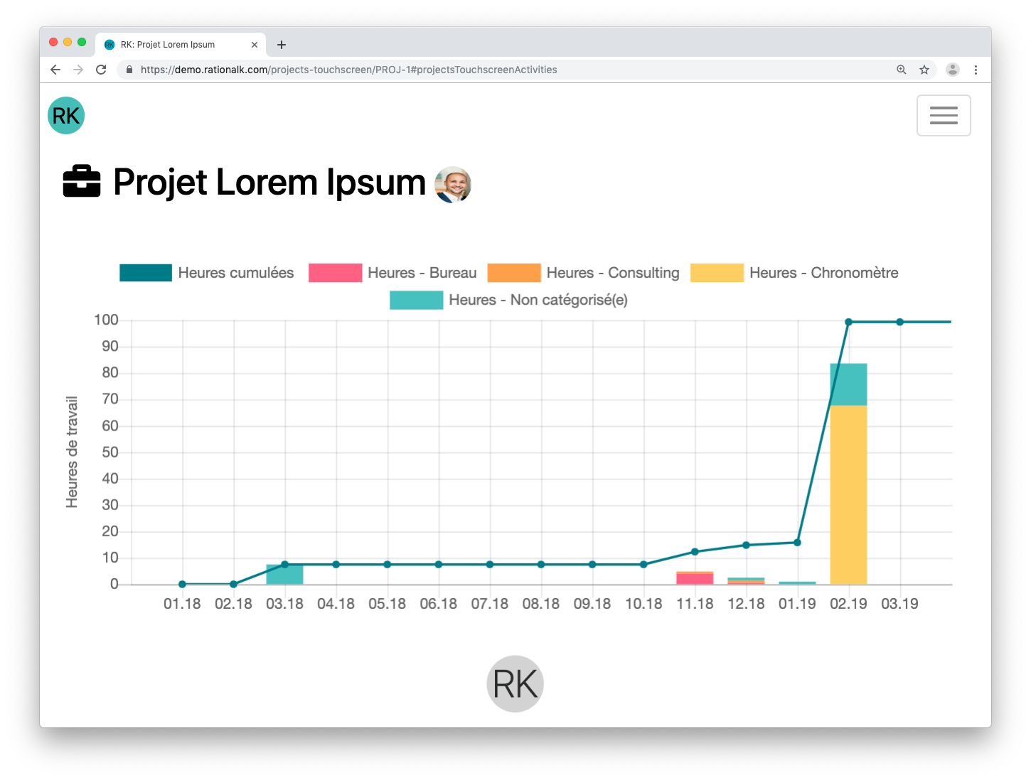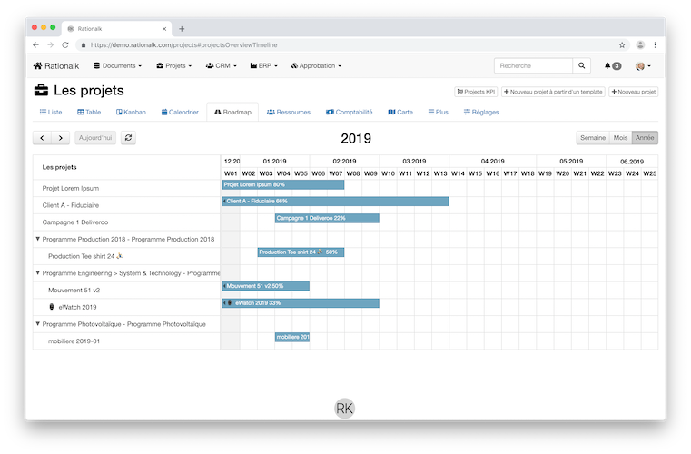 Cockpit de management Mon tableau de bord personnel Le kanban des projets La roadmap d'un portefeuile de projets avec la vue des sous phases et les dépendances entre différents projets La roadmap des projets Outil Gantt pour la planification d'un projet Outil d'ordonnancement équipes et machines (connecté avec le Gantt) Une tâche projet Visualiser la charge des ressources Le kanban des tâches par équipe La documentation projet (fichiers et bases de données) Vue trimestrielle pour le CoDir Indicateurs financiers consolidés sur un portefeuille de projets Personnalisation du design selon votre chart graphique Application smartphone et tablette Extranet pour impliquer vos clients et fournisseurs Heures réélles/budgétées Heures travaillées par catégorie Heures travaillées par date Demandes de vacances (et maladie, ...)