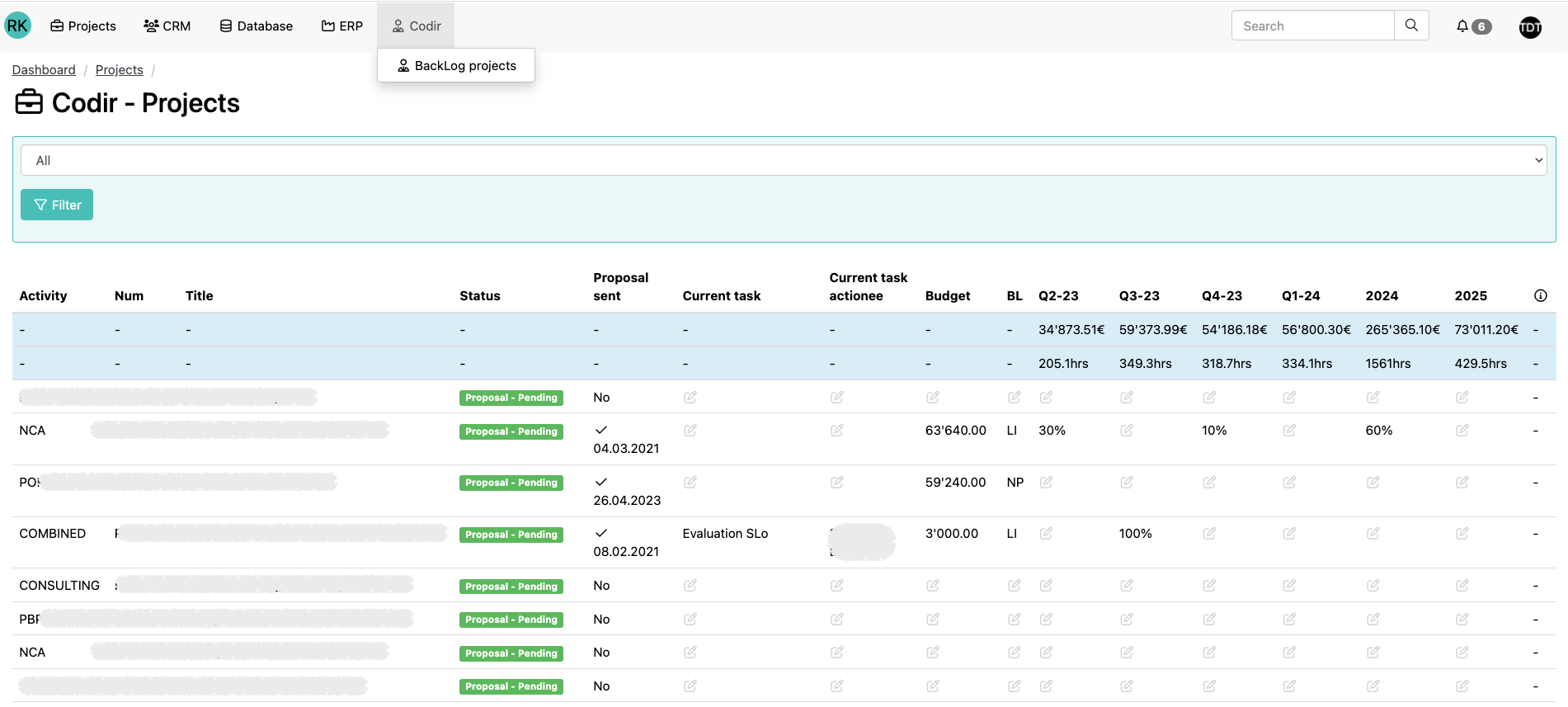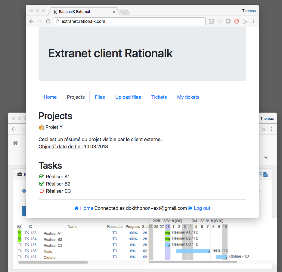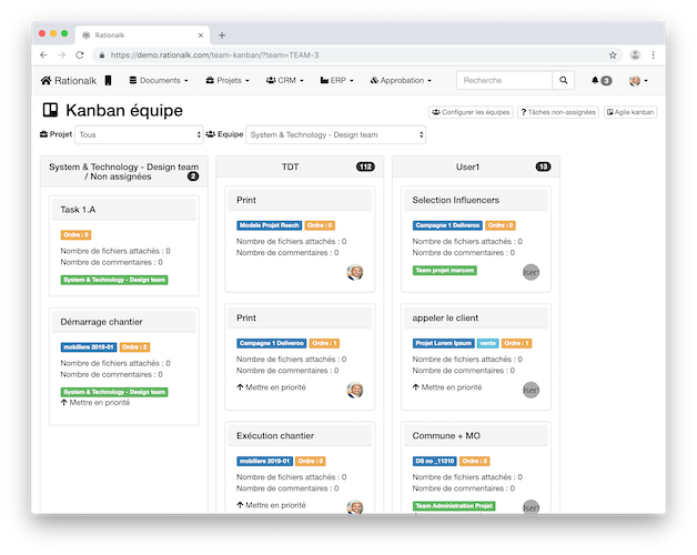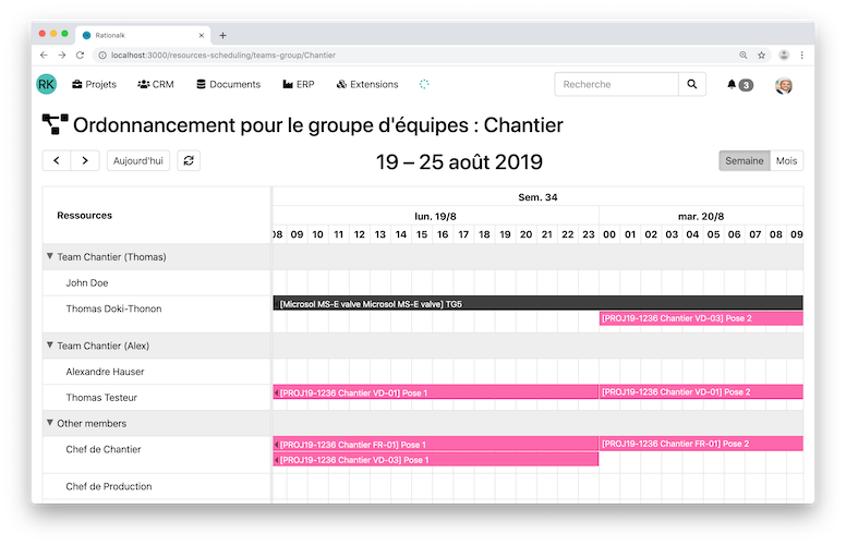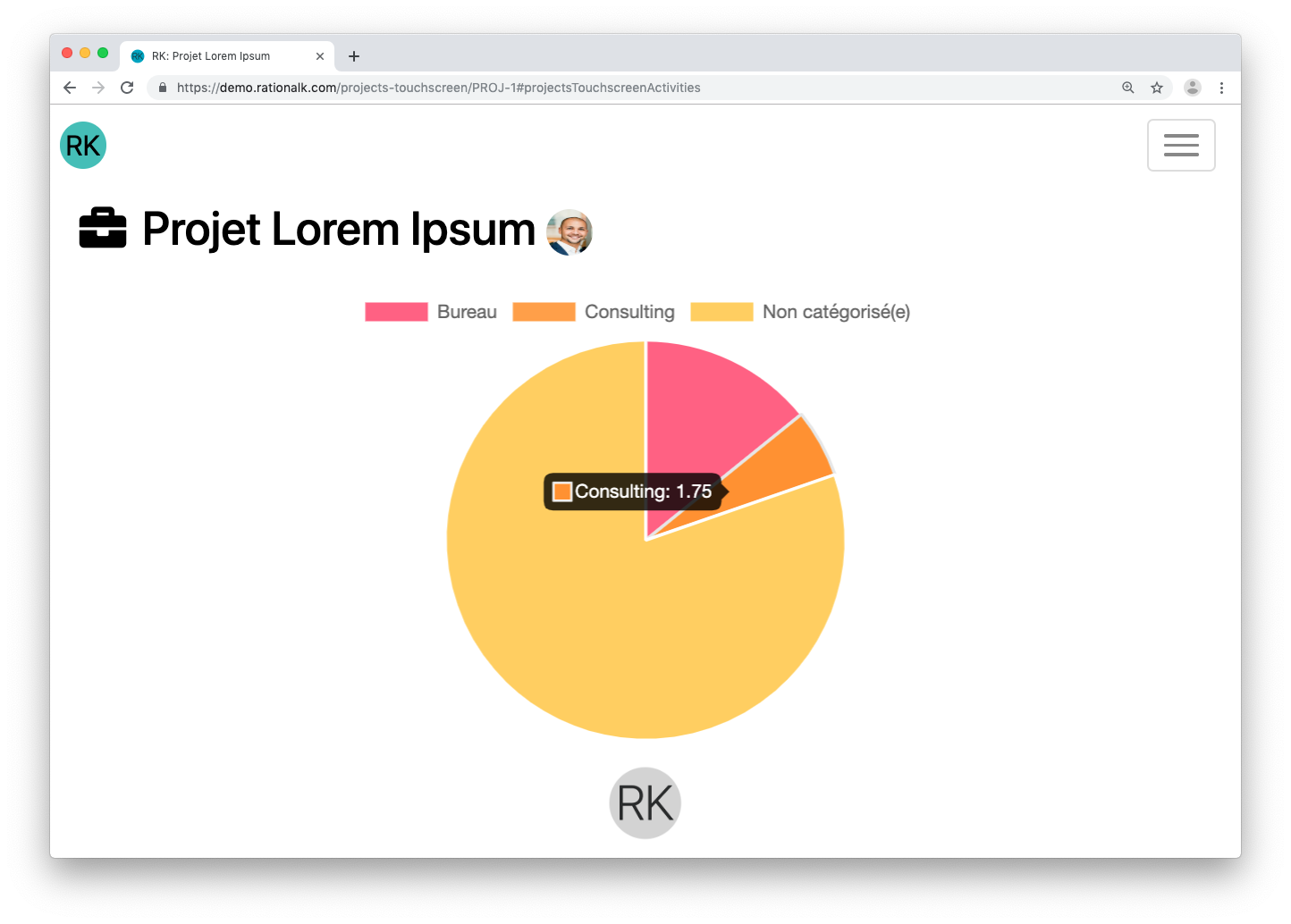 Cockpit de management Mon tableau de bord personnel Le kanban des projets La roadmap d'un portefeuile de projets avec la vue des sous phases et les dépendances entre différents projets La roadmap des projets Outil Gantt pour la planification d'un projet Outil d'ordonnancement équipes et machines (connecté avec le Gantt) Une tâche projet Visualiser la charge des ressources Le kanban des tâches par équipe La documentation projet (fichiers et bases de données) Vue trimestrielle pour le CoDir Indicateurs financiers consolidés sur un portefeuille de projets Personnalisation du design selon votre chart graphique Application smartphone et tablette Extranet pour impliquer vos clients et fournisseurs Heures réélles/budgétées Heures travaillées par catégorie Heures travaillées par date Demandes de vacances (et maladie, ...)